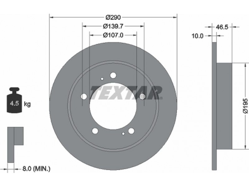 Criteries : Βάρος [kg] 4,5, Διάμετρος κέντρωσης [mm] 107, Διάμετρος κύκλου οπής [mm] 139,7, Διάμετρος οπής μπουλονιού τροχού [mm] 12,8, Ελάχιστο πάχος [mm] 8, Εξωτερική διάμετρος [mm] 290, Επιφάνεια με επίστρωση, Εσωτερική διάμετρος [mm] 182,6, μήκος συσκευασίας [cm] 30,8, Πατρόν τρύπας/αριθμός τρυπών 05/07, Πάχος δισκόπλακας [mm] 10, πλάτος συσκευασίας [cm] 30,8, Συμπληρωματικό προϊόν/ πληροφορίες 2 χωρίς μπουλόνια στερέωσης τροχού, Συμπληρωματικό προϊόν/ πληροφορίες 2 χωρίς πλήμνη, Συμπληρωματικό προϊόν/ πληροφορίες 2 χωρίς ρουλεμάν τροχού, Τύπος δισκόφρενων πλήρες, Υψος [mm] 46,5, ύψος συσκευασίας [cm] 12,7