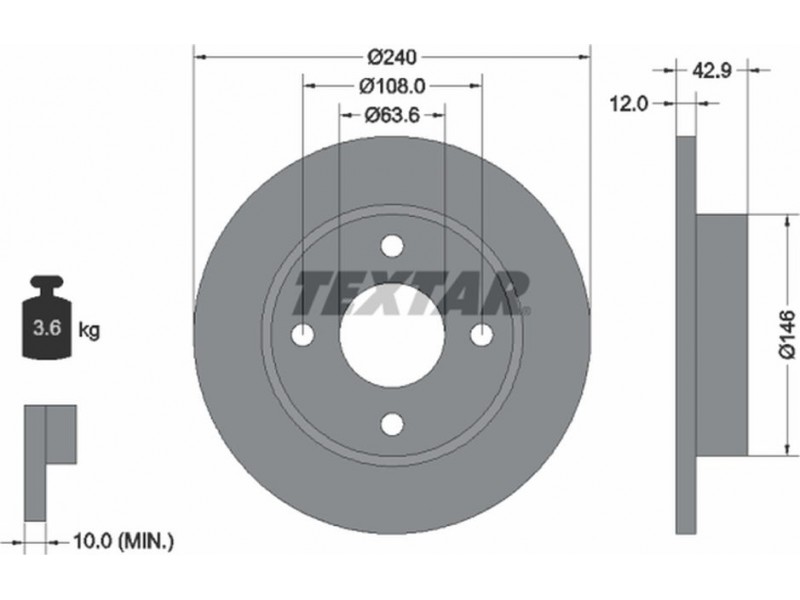 Criteries : Βάρος [kg] 3,6, Διάμετρος κέντρωσης [mm] 63,6, Διάμετρος κύκλου οπής [mm] 108, Διάμετρος οπής μπουλονιού τροχού [mm] 13,8, Ελάχιστο πάχος [mm] 10, Εξωτερική διάμετρος [mm] 240, Επιφάνεια με επίστρωση, Εσωτερική διάμετρος [mm] 136, μήκος συσκευασίας [cm] 24,8, Πατρόν τρύπας/αριθμός τρυπών 04/04, Πάχος δισκόπλακας [mm] 12, πλάτος συσκευασίας [cm] 24,8, Συμπληρωματικό προϊόν/ πληροφορίες 2 χωρίς μπουλόνια στερέωσης τροχού, Συμπληρωματικό προϊόν/ πληροφορίες 2 χωρίς πλήμνη, Συμπληρωματικό προϊόν/ πληροφορίες 2 χωρίς ρουλεμάν τροχού, Τύπος δισκόφρενων πλήρες, Υψος [mm] 42,9, ύψος συσκευασίας [cm] 10,5