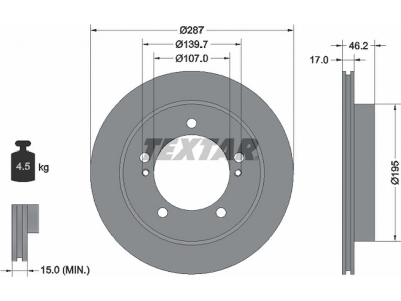 Criteries : Βάρος [kg] 4,5, Διάμετρος κέντρωσης [mm] 107, Διάμετρος κύκλου οπής [mm] 139,7, Διάμετρος οπής μπουλονιού τροχού [mm] 12,8, Ελάχιστο πάχος [mm] 15, Εξωτερική διάμετρος [mm] 287, Εσωτερική διάμετρος [mm] 183,2, μήκος συσκευασίας [cm] 30,8, Πατρόν τρύπας/αριθμός τρυπών 05/07, Πάχος δισκόπλακας [mm] 17, πλάτος συσκευασίας [cm] 30,8, Συμπληρωματικό προϊόν/ πληροφορίες 2 χωρίς μπουλόνια στερέωσης τροχού, Συμπληρωματικό προϊόν/ πληροφορίες 2 χωρίς πλήμνη, Συμπληρωματικό προϊόν/ πληροφορίες 2 χωρίς ρουλεμάν τροχού, Τύπος δισκόφρενων εσωτερικά αεριζόμενο, Υψος [mm] 46,2, ύψος συσκευασίας [cm] 12,7