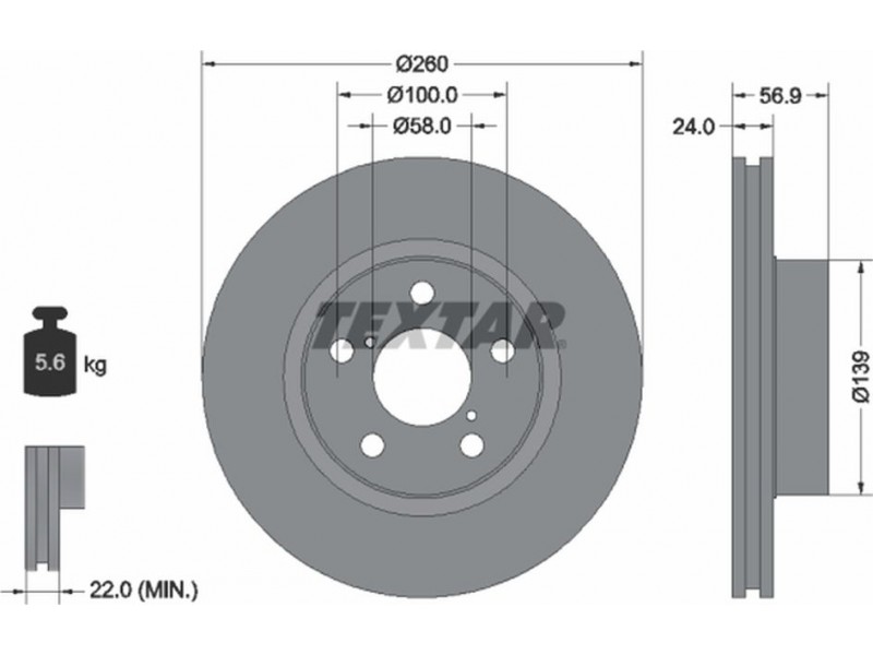 Criteries : Βάρος [kg] 5,6, Διάμετρος κέντρωσης [mm] 58, Διάμετρος κύκλου οπής [mm] 100, Διάμετρος οπής μπουλονιού τροχού [mm] 12,7, Ελάχιστο πάχος [mm] 22, Εξωτερική διάμετρος [mm] 260, Εσωτερική διάμετρος [mm] 128,8, μήκος συσκευασίας [cm] 27,8, Πατρόν τρύπας/αριθμός τρυπών 05/07, Πάχος δισκόπλακας [mm] 24, πλάτος συσκευασίας [cm] 27,8, Συμπληρωματικό προϊόν/ πληροφορίες 2 χωρίς μπουλόνια στερέωσης τροχού, Συμπληρωματικό προϊόν/ πληροφορίες 2 χωρίς πλήμνη, Συμπληρωματικό προϊόν/ πληροφορίες 2 χωρίς ρουλεμάν τροχού, Τύπος δισκόφρενων εσωτερικά αεριζόμενο, Υψος [mm] 56,9, ύψος συσκευασίας [cm] 15,5
