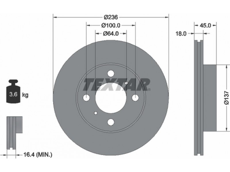 Criteries : Βάρος [kg] 3,7, Διάμετρος κέντρωσης [mm] 64, Διάμετρος κύκλου οπής [mm] 100, Διάμετρος οπής μπουλονιού τροχού [mm] 13, Ελάχιστο πάχος [mm] 16,4, Εξωτερική διάμετρος [mm] 236, Εσωτερική διάμετρος [mm] 126, μήκος συσκευασίας [cm] 26,3, Πατρόν τρύπας/αριθμός τρυπών 04/06, Πάχος δισκόπλακας [mm] 18, πλάτος συσκευασίας [cm] 26,3, Συμπληρωματικό προϊόν/ πληροφορίες 2 χωρίς μπουλόνια στερέωσης τροχού, Συμπληρωματικό προϊόν/ πληροφορίες 2 χωρίς πλήμνη, Συμπληρωματικό προϊόν/ πληροφορίες 2 χωρίς ρουλεμάν τροχού, Τύπος δισκόφρενων εσωτερικά αεριζόμενο, Υψος [mm] 45, ύψος συσκευασίας [cm] 13,5