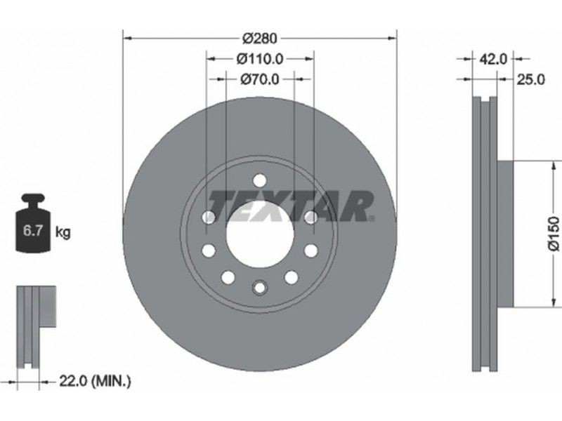 Criteries : Βάρος [kg] 6,7, Διάμετρος κέντρωσης [mm] 70, Διάμετρος κύκλου οπής [mm] 110, Διάμετρος οπής μπουλονιού τροχού [mm] 14, Ελάχιστο πάχος [mm] 22, Εξωτερική διάμετρος [mm] 280, Επιφάνεια με επίστρωση, Εσωτερική διάμετρος [mm] 139, μήκος συσκευασίας [cm] 29,3, Πατρόν τρύπας/αριθμός τρυπών 05/08, Πάχος δισκόπλακας [mm] 25, πλάτος συσκευασίας [cm] 29,3, Συμπληρωματικό προϊόν/ πληροφορίες 2 χωρίς μπουλόνια στερέωσης τροχού, Συμπληρωματικό προϊόν/ πληροφορίες 2 χωρίς πλήμνη, Συμπληρωματικό προϊόν/ πληροφορίες 2 χωρίς ρουλεμάν τροχού, Τύπος δισκόφρενων εσωτερικά αεριζόμενο, Υψος [mm] 42, ύψος συσκευασίας [cm] 10,5