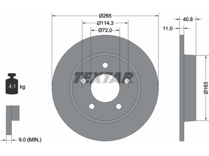 Criteries : Βάρος [kg] 4,1, Διάμετρος κέντρωσης [mm] 72, Διάμετρος κύκλου οπής [mm] 114,3, Διάμετρος οπής μπουλονιού τροχού [mm] 13,8, Ελάχιστο πάχος [mm] 9, Εξωτερική διάμετρος [mm] 265, Εσωτερική διάμετρος [mm] 152, μήκος συσκευασίας [cm] 27,8, Πατρόν τρύπας/αριθμός τρυπών 05/05, Πάχος δισκόπλακας [mm] 11, πλάτος συσκευασίας [cm] 27,8, Συμπληρωματικό προϊόν/ πληροφορίες 2 χωρίς μπουλόνια στερέωσης τροχού, Συμπληρωματικό προϊόν/ πληροφορίες 2 χωρίς πλήμνη, Συμπληρωματικό προϊόν/ πληροφορίες 2 χωρίς ρουλεμάν τροχού, Τύπος δισκόφρενων πλήρες, Υψος [mm] 40,8, ύψος συσκευασίας [cm] 10,5