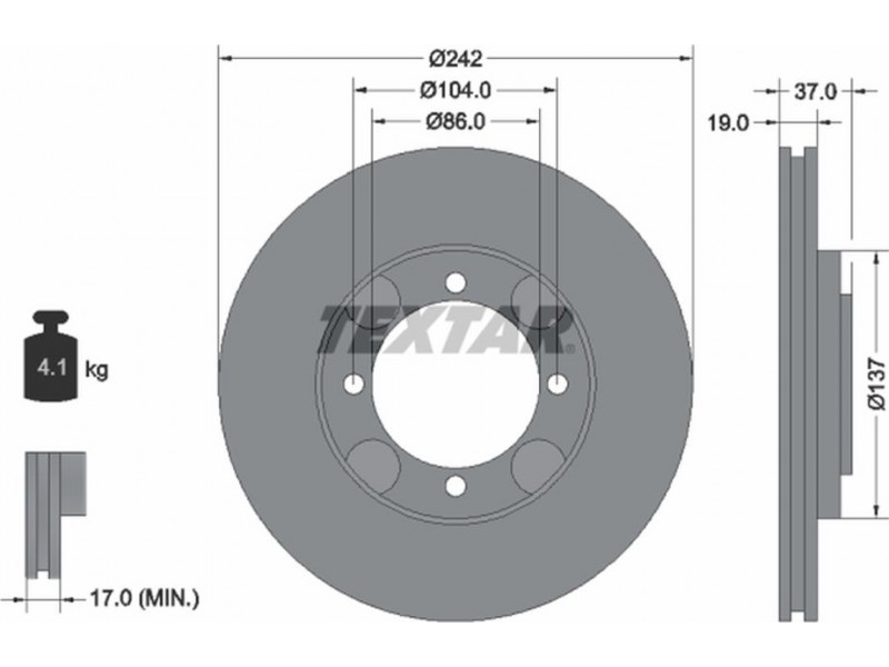 Criteries : Βάρος [kg] 4,1, Διάμετρος κέντρωσης [mm] 86, Διάμετρος κύκλου οπής [mm] 104, Διάμετρος οπής μπουλονιού τροχού [mm] 28,8, Ελάχιστο πάχος [mm] 17, Εξωτερική διάμετρος [mm] 242, Εσωτερική διάμετρος [mm] 126, μήκος συσκευασίας [cm] 27,8, Πατρόν τρύπας/αριθμός τρυπών 04/04, Πάχος δισκόπλακας [mm] 19, πλάτος συσκευασίας [cm] 27,8, Συμπληρωματικό προϊόν/ πληροφορίες 2 χωρίς μπουλόνια στερέωσης τροχού, Συμπληρωματικό προϊόν/ πληροφορίες 2 χωρίς πλήμνη, Συμπληρωματικό προϊόν/ πληροφορίες 2 χωρίς ρουλεμάν τροχού, Τύπος δισκόφρενων εσωτερικά αεριζόμενο, Υψος [mm] 37, ύψος συσκευασίας [cm] 10,5