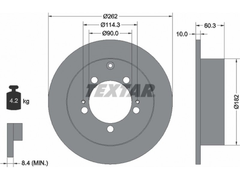 Criteries : Βάρος [kg] 4,2, Διάμετρος κέντρωσης [mm] 90, Διάμετρος κύκλου οπής [mm] 114,3, Διάμετρος οπής μπουλονιού τροχού [mm] 12,5, Ελάχιστο πάχος [mm] 8,4, Εξωτερική διάμετρος [mm] 262, Επιφάνεια με επίστρωση, Εσωτερική διάμετρος [mm] 168, μήκος συσκευασίας [cm] 27,8, Πατρόν τρύπας/αριθμός τρυπών 05/08, Πάχος δισκόπλακας [mm] 10, πλάτος συσκευασίας [cm] 27,8, Συμπληρωματικό προϊόν/ πληροφορίες 2 χωρίς μπουλόνια στερέωσης τροχού, Συμπληρωματικό προϊόν/ πληροφορίες 2 χωρίς πλήμνη, Συμπληρωματικό προϊόν/ πληροφορίες 2 χωρίς ρουλεμάν τροχού, Τύπος δισκόφρενων πλήρες, Υψος [mm] 60,3, ύψος συσκευασίας [cm] 15,5
