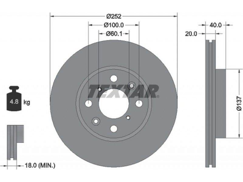 Criteries : Βάρος [kg] 4,8, Διάμετρος κέντρωσης [mm] 60,1, Διάμετρος κύκλου οπής [mm] 100, Διάμετρος οπής μπουλονιού τροχού [mm] 12,6, Ελάχιστο πάχος [mm] 18, Εξωτερική διάμετρος [mm] 252, Επιφάνεια με επίστρωση, Εσωτερική διάμετρος [mm] 127,1, μήκος συσκευασίας [cm] 27,8, Πατρόν τρύπας/αριθμός τρυπών 04/08, Πάχος δισκόπλακας [mm] 20, πλάτος συσκευασίας [cm] 27,8, Συμπληρωματικό προϊόν/ πληροφορίες 2 χωρίς μπουλόνια στερέωσης τροχού, Συμπληρωματικό προϊόν/ πληροφορίες 2 χωρίς πλήμνη, Συμπληρωματικό προϊόν/ πληροφορίες 2 χωρίς ρουλεμάν τροχού, Τύπος δισκόφρενων εσωτερικά αεριζόμενο, Υψος [mm] 40, ύψος συσκευασίας [cm] 10,5