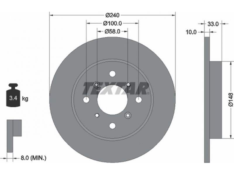 Criteries : Βάρος [kg] 3,4, Διάμετρος κέντρωσης [mm] 58, Διάμετρος κύκλου οπής [mm] 100, Διάμετρος οπής μπουλονιού τροχού [mm] 12,7, Ελάχιστο πάχος [mm] 8, Εξωτερική διάμετρος [mm] 240, Εσωτερική διάμετρος [mm] 137, μήκος συσκευασίας [cm] 27,8, Πατρόν τρύπας/αριθμός τρυπών 04/08, Πάχος δισκόπλακας [mm] 10, πλάτος συσκευασίας [cm] 27,8, Συμπληρωματικό προϊόν/ πληροφορίες 2 χωρίς μπουλόνια στερέωσης τροχού, Συμπληρωματικό προϊόν/ πληροφορίες 2 χωρίς πλήμνη, Συμπληρωματικό προϊόν/ πληροφορίες 2 χωρίς ρουλεμάν τροχού, Τύπος δισκόφρενων πλήρες, Υψος [mm] 33, ύψος συσκευασίας [cm] 8,4