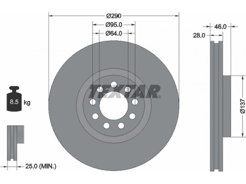 Criteries : Βάρος [kg] 8,5, Διάμετρος κέντρωσης [mm] 64, Διάμετρος κύκλου οπής [mm] 95, Διάμετρος οπής μπουλονιού τροχού [mm] 12,5, Ελάχιστο πάχος [mm] 25, Εξωτερική διάμετρος [mm] 290, Εσωτερική διάμετρος [mm] 123,6, μήκος συσκευασίας [cm] 30,8, Πατρόν τρύπας/αριθμός τρυπών 09/09, Πάχος δισκόπλακας [mm] 28, πλάτος συσκευασίας [cm] 30,8, Συμπληρωματικό προϊόν/ πληροφορίες 2 χωρίς μπουλόνια στερέωσης τροχού, Συμπληρωματικό προϊόν/ πληροφορίες 2 χωρίς πλήμνη, Συμπληρωματικό προϊόν/ πληροφορίες 2 χωρίς ρουλεμάν τροχού, Τύπος δισκόφρενων εσωτερικά αεριζόμενο, Υψος [mm] 46, ύψος συσκευασίας [cm] 12,7