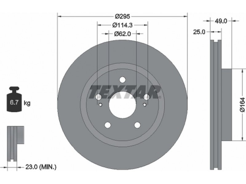 Criteries : Βάρος [kg] 6,7, Διάμετρος κέντρωσης [mm] 62, Διάμετρος κύκλου οπής [mm] 114,3, Διάμετρος οπής μπουλονιού τροχού [mm] 12,8, Ελάχιστο πάχος [mm] 23, Εξωτερική διάμετρος [mm] 295, Επιφάνεια με επίστρωση, Εσωτερική διάμετρος [mm] 154, μήκος συσκευασίας [cm] 30,8, Πατρόν τρύπας/αριθμός τρυπών 05/07, Πάχος δισκόπλακας [mm] 25, πλάτος συσκευασίας [cm] 30,8, Συμπληρωματικό προϊόν/ πληροφορίες 2 χωρίς μπουλόνια στερέωσης τροχού, Συμπληρωματικό προϊόν/ πληροφορίες 2 χωρίς πλήμνη, Συμπληρωματικό προϊόν/ πληροφορίες 2 χωρίς ρουλεμάν τροχού, Τύπος δισκόφρενων εσωτερικά αεριζόμενο, Υψος [mm] 49, ύψος συσκευασίας [cm] 12,7