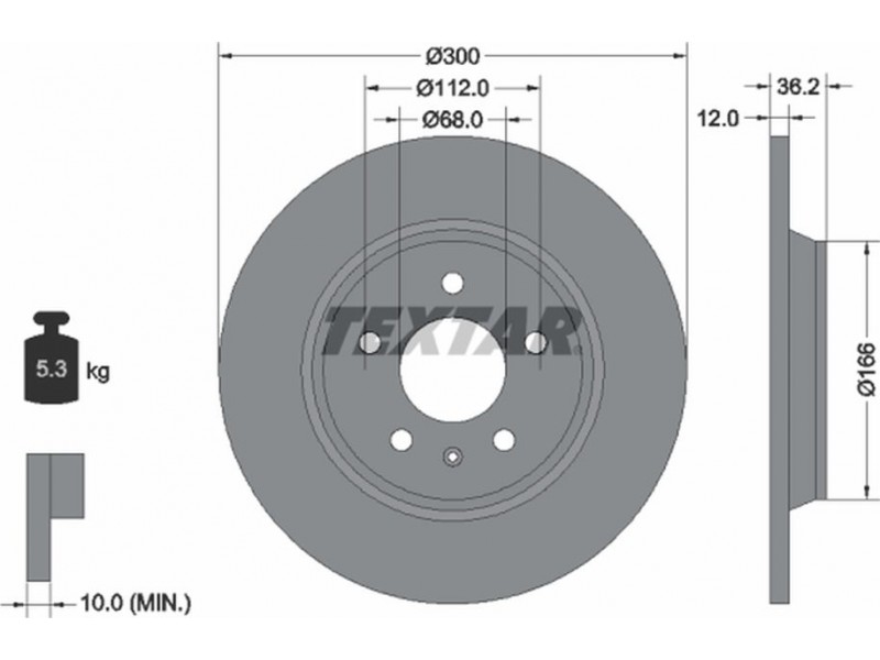 Criteries : Βάρος [kg] 5,3, Διάμετρος κέντρωσης [mm] 68, Διάμετρος κύκλου οπής [mm] 112, Διάμετρος οπής μπουλονιού τροχού [mm] 15,3, Ελάχιστο πάχος [mm] 10, Εξωτερική διάμετρος [mm] 300, Επιφάνεια με επίστρωση, Εσωτερική διάμετρος [mm] 169, μήκος συσκευασίας [cm] 31,3, Πατρόν τρύπας/αριθμός τρυπών 05/06, Πάχος δισκόπλακας [mm] 12, πλάτος συσκευασίας [cm] 31,3, Συμπληρωματικό προϊόν/ πληροφορίες 2 χωρίς μπουλόνια στερέωσης τροχού, Συμπληρωματικό προϊόν/ πληροφορίες 2 χωρίς πλήμνη, Συμπληρωματικό προϊόν/ πληροφορίες 2 χωρίς ρουλεμάν τροχού, Τύπος δισκόφρενων πλήρες, Υψος [mm] 36,2, ύψος συσκευασίας [cm] 10