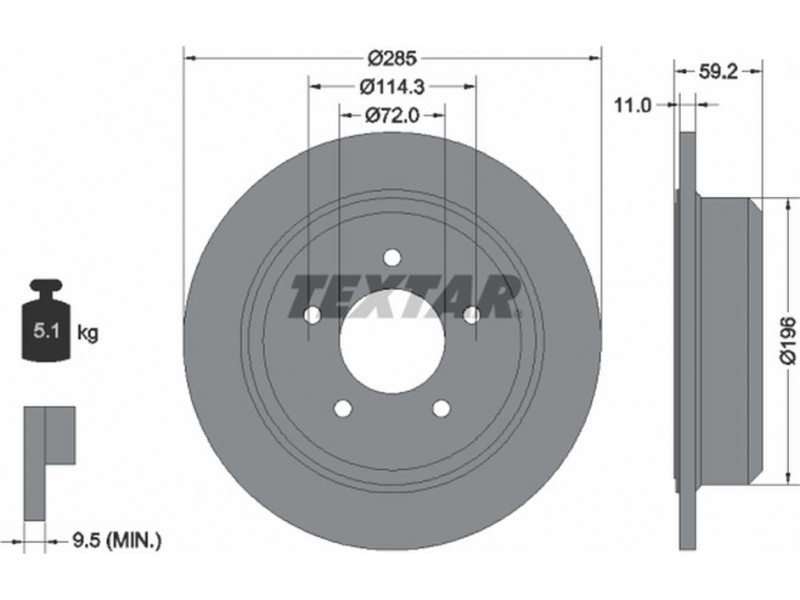 Criteries : Βάρος [kg] 5,1, Διάμετρος κέντρωσης [mm] 72, Διάμετρος κύκλου οπής [mm] 114,3, Διάμετρος οπής μπουλονιού τροχού [mm] 15,6, Ελάχιστο πάχος [mm] 9,5, Εξωτερική διάμετρος [mm] 285, Επιφάνεια με επίστρωση, Εσωτερική διάμετρος [mm] 184, μήκος συσκευασίας [cm] 31,3, Πατρόν τρύπας/αριθμός τρυπών 05/05, Πάχος δισκόπλακας [mm] 11, πλάτος συσκευασίας [cm] 31,3, Συμπληρωματικό προϊόν/ πληροφορίες 2 χωρίς μπουλόνια στερέωσης τροχού, Συμπληρωματικό προϊόν/ πληροφορίες 2 χωρίς πλήμνη, Συμπληρωματικό προϊόν/ πληροφορίες 2 χωρίς ρουλεμάν τροχού, Τύπος δισκόφρενων πλήρες, Υψος [mm] 59,2, ύψος συσκευασίας [cm] 14