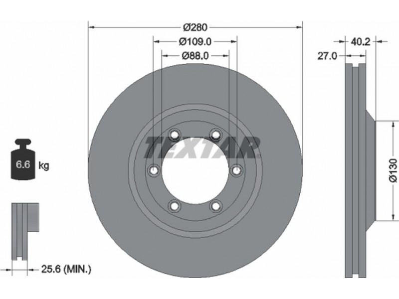 Criteries : Βάρος [kg] 6,6, Διάμετρος κέντρωσης [mm] 88, Διάμετρος κύκλου οπής [mm] 109, Διάμετρος οπής μπουλονιού τροχού [mm] 12, Ελάχιστο πάχος [mm] 25,6, Εξωτερική διάμετρος [mm] 280, Επιφάνεια με επίστρωση, Εσωτερική διάμετρος [mm] 1, μήκος συσκευασίας [cm] 29,3, Πατρόν τρύπας/αριθμός τρυπών 06/06, Πάχος δισκόπλακας [mm] 27, πλάτος συσκευασίας [cm] 29,3, Συμπληρωματικό προϊόν/ πληροφορίες 2 χωρίς μπουλόνια στερέωσης τροχού, Συμπληρωματικό προϊόν/ πληροφορίες 2 χωρίς πλήμνη, Συμπληρωματικό προϊόν/ πληροφορίες 2 χωρίς ρουλεμάν τροχού, Τύπος δισκόφρενων εσωτερικά αεριζόμενο, Υψος [mm] 40,2, ύψος συσκευασίας [cm] 10,5