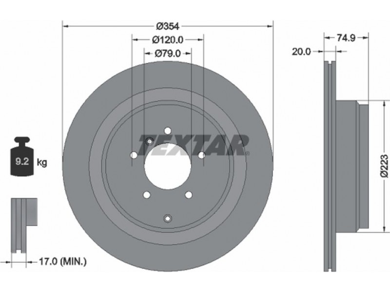 Criteries : Βάρος [kg] 9,2, Διάμετρος κέντρωσης [mm] 79, Διάμετρος κύκλου οπής [mm] 120, Διάμετρος οπής μπουλονιού τροχού [mm] 16,6, Ελάχιστο πάχος [mm] 17, Εξωτερική διάμετρος [mm] 354, Επιφάνεια με επίστρωση, Εσωτερική διάμετρος [mm] 210,1, μήκος συσκευασίας [cm] 37,3, Πατρόν τρύπας/αριθμός τρυπών 05/07, Πάχος δισκόπλακας [mm] 20, πλάτος συσκευασίας [cm] 37,3, Συμπληρωματικό προϊόν/ πληροφορίες 2 χωρίς μπουλόνια στερέωσης τροχού, Συμπληρωματικό προϊόν/ πληροφορίες 2 χωρίς πλήμνη, Συμπληρωματικό προϊόν/ πληροφορίες 2 χωρίς ρουλεμάν τροχού, Τύπος δισκόφρενων εξωτερικά αεριζόμενο, Υψος [mm] 74,9, ύψος συσκευασίας [cm] 10,5
