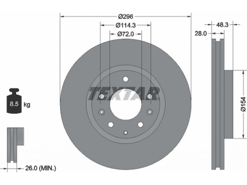 Criteries : Βάρος [kg] 8,5, Διάμετρος κέντρωσης [mm] 72, Διάμετρος κύκλου οπής [mm] 114,3, Διάμετρος οπής μπουλονιού τροχού [mm] 13,1, Ελάχιστο πάχος [mm] 26, Εξωτερική διάμετρος [mm] 296, Επιφάνεια με επίστρωση, Εσωτερική διάμετρος [mm] 142,8, μήκος συσκευασίας [cm] 30,8, Πατρόν τρύπας/αριθμός τρυπών 05/08, Πάχος δισκόπλακας [mm] 28, πλάτος συσκευασίας [cm] 30,8, Συμπληρωματικό προϊόν/ πληροφορίες 2 χωρίς μπουλόνια στερέωσης τροχού, Συμπληρωματικό προϊόν/ πληροφορίες 2 χωρίς πλήμνη, Συμπληρωματικό προϊόν/ πληροφορίες 2 χωρίς ρουλεμάν τροχού, Τύπος δισκόφρενων εσωτερικά αεριζόμενο, Υψος [mm] 48,3, ύψος συσκευασίας [cm] 12,7