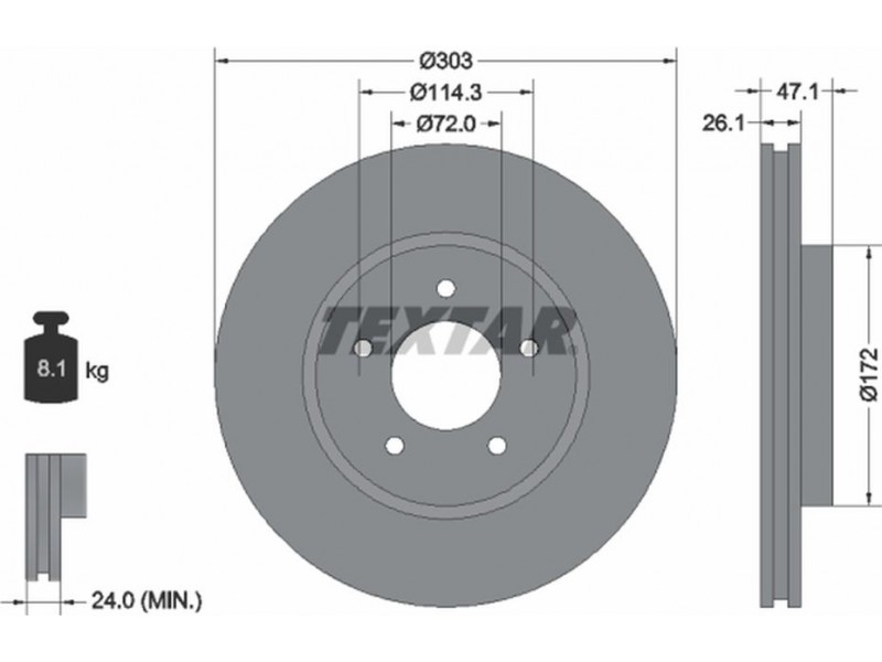 Criteries : Βάρος [kg] 8,1, Διάμετρος κέντρωσης [mm] 72, Διάμετρος κύκλου οπής [mm] 114,3, Διάμετρος οπής μπουλονιού τροχού [mm] 14, Ελάχιστο πάχος [mm] 24, Εξωτερική διάμετρος [mm] 303, Επιφάνεια με επίστρωση, Εσωτερική διάμετρος [mm] 159, μήκος συσκευασίας [cm] 32,8, Πατρόν τρύπας/αριθμός τρυπών 05/05, Πάχος δισκόπλακας [mm] 26,1, πλάτος συσκευασίας [cm] 32,8, Συμπληρωματικό προϊόν/ πληροφορίες 2 χωρίς μπουλόνια στερέωσης τροχού, Συμπληρωματικό προϊόν/ πληροφορίες 2 χωρίς πλήμνη, Συμπληρωματικό προϊόν/ πληροφορίες 2 χωρίς ρουλεμάν τροχού, Τύπος δισκόφρενων εσωτερικά αεριζόμενο, Υψος [mm] 47,1, ύψος συσκευασίας [cm] 12,5
