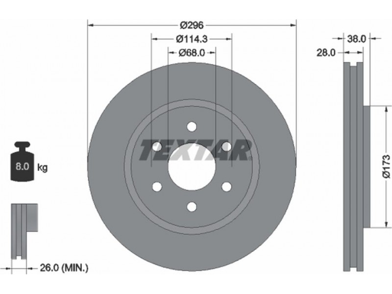 Criteries : Βάρος [kg] 8, Διάμετρος κέντρωσης [mm] 68, Διάμετρος κύκλου οπής [mm] 114,3, Διάμετρος οπής μπουλονιού τροχού [mm] 12,7, Ελάχιστο πάχος [mm] 26, Εξωτερική διάμετρος [mm] 296, Επιφάνεια με επίστρωση, Εσωτερική διάμετρος [mm] 161,1, μήκος συσκευασίας [cm] 31,3, Πατρόν τρύπας/αριθμός τρυπών 06/06, Πάχος δισκόπλακας [mm] 28, πλάτος συσκευασίας [cm] 31,3, Συμπληρωματικό προϊόν/ πληροφορίες 2 χωρίς μπουλόνια στερέωσης τροχού, Συμπληρωματικό προϊόν/ πληροφορίες 2 χωρίς πλήμνη, Συμπληρωματικό προϊόν/ πληροφορίες 2 χωρίς ρουλεμάν τροχού, Τύπος δισκόφρενων εσωτερικά αεριζόμενο, Υψος [mm] 38, ύψος συσκευασίας [cm] 10