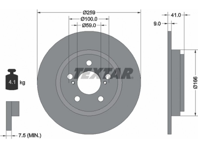 Criteries : Βάρος [kg] 4,1, Διάμετρος κέντρωσης [mm] 59, Διάμετρος κύκλου οπής [mm] 100, Διάμετρος οπής μπουλονιού τροχού [mm] 16,5, Ελάχιστο πάχος [mm] 7,5, Εξωτερική διάμετρος [mm] 259, Εσωτερική διάμετρος [mm] 156, μήκος συσκευασίας [cm] 27,8, Πατρόν τρύπας/αριθμός τρυπών 05/07, Πάχος δισκόπλακας [mm] 9, πλάτος συσκευασίας [cm] 27,8, Συμπληρωματικό προϊόν/ πληροφορίες 2 χωρίς μπουλόνια στερέωσης τροχού, Συμπληρωματικό προϊόν/ πληροφορίες 2 χωρίς πλήμνη, Συμπληρωματικό προϊόν/ πληροφορίες 2 χωρίς ρουλεμάν τροχού, Τύπος δισκόφρενων πλήρες, Υψος [mm] 41, ύψος συσκευασίας [cm] 10,5
