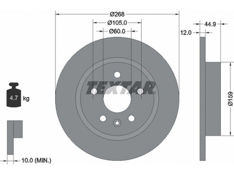 Criteries : Βάρος [kg] 4,7, Διάμετρος κέντρωσης [mm] 60, Διάμετρος κύκλου οπής [mm] 105, Διάμετρος οπής μπουλονιού τροχού [mm] 14,3, Ελάχιστο πάχος [mm] 10, Εξωτερική διάμετρος [mm] 268, Επιφάνεια με επίστρωση, Εσωτερική διάμετρος [mm] 147, μήκος συσκευασίας [cm] 27,8, Πατρόν τρύπας/αριθμός τρυπών 05/06, Πάχος δισκόπλακας [mm] 12, πλάτος συσκευασίας [cm] 27,8, Συμπληρωματικό προϊόν/ πληροφορίες 2 χωρίς μπουλόνια στερέωσης τροχού, Συμπληρωματικό προϊόν/ πληροφορίες 2 χωρίς πλήμνη, Συμπληρωματικό προϊόν/ πληροφορίες 2 χωρίς ρουλεμάν τροχού, Τύπος δισκόφρενων πλήρες, Υψος [mm] 44,9, ύψος συσκευασίας [cm] 10,5