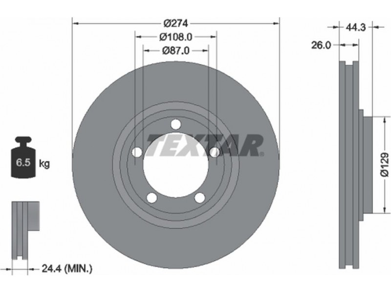 Criteries : Βάρος [kg] 6,5, Διάμετρος κέντρωσης [mm] 87, Διάμετρος κύκλου οπής [mm] 108, Διάμετρος οπής μπουλονιού τροχού [mm] 10,5, Ελάχιστο πάχος [mm] 24,4, Εξωτερική διάμετρος [mm] 274, Εσωτερική διάμετρος [mm] 131,8, μήκος συσκευασίας [cm] 29,3, Πατρόν τρύπας/αριθμός τρυπών 05/05, Πάχος δισκόπλακας [mm] 26, πλάτος συσκευασίας [cm] 29,3, Συμπληρωματικό προϊόν/ πληροφορίες 2 χωρίς μπουλόνια στερέωσης τροχού, Συμπληρωματικό προϊόν/ πληροφορίες 2 χωρίς πλήμνη, Συμπληρωματικό προϊόν/ πληροφορίες 2 χωρίς ρουλεμάν τροχού, Τύπος δισκόφρενων εσωτερικά αεριζόμενο, Υψος [mm] 44,3, ύψος συσκευασίας [cm] 10,5