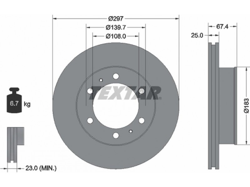 Criteries : Βάρος [kg] 6,7, Διάμετρος κέντρωσης [mm] 108, Διάμετρος κύκλου οπής [mm] 139,7, Διάμετρος οπής μπουλονιού τροχού [mm] 14,5, Ελάχιστο πάχος [mm] 23, Εξωτερική διάμετρος [mm] 297, Εσωτερική διάμετρος [mm] 170, μήκος συσκευασίας [cm] 30,8, Πατρόν τρύπας/αριθμός τρυπών 06/08, Πάχος δισκόπλακας [mm] 25, πλάτος συσκευασίας [cm] 30,8, Συμπληρωματικό προϊόν/ πληροφορίες 2 χωρίς μπουλόνια στερέωσης τροχού, Συμπληρωματικό προϊόν/ πληροφορίες 2 χωρίς πλήμνη, Συμπληρωματικό προϊόν/ πληροφορίες 2 χωρίς ρουλεμάν τροχού, Τύπος δισκόφρενων εσωτερικά αεριζόμενο, Υψος [mm] 67,4, ύψος συσκευασίας [cm] 16
