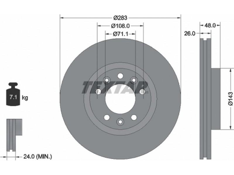 Criteries : Βάρος [kg] 7,1, Διάμετρος κέντρωσης [mm] 71,1, Διάμετρος κύκλου οπής [mm] 108, Διάμετρος οπής μπουλονιού τροχού [mm] 13,5, Ελάχιστο πάχος [mm] 24, Εξωτερική διάμετρος [mm] 283, Επιφάνεια με επίστρωση, Εσωτερική διάμετρος [mm] 133,1, μήκος συσκευασίας [cm] 30,8, Πατρόν τρύπας/αριθμός τρυπών 05/08, Πάχος δισκόπλακας [mm] 26, πλάτος συσκευασίας [cm] 30,8, Συμπληρωματικό προϊόν/ πληροφορίες 2 χωρίς μπουλόνια στερέωσης τροχού, Συμπληρωματικό προϊόν/ πληροφορίες 2 χωρίς πλήμνη, Συμπληρωματικό προϊόν/ πληροφορίες 2 χωρίς ρουλεμάν τροχού, Τύπος δισκόφρενων εσωτερικά αεριζόμενο, Υψος [mm] 48, ύψος συσκευασίας [cm] 12,7