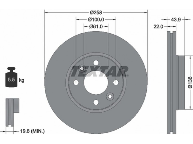 Criteries : Βάρος [kg] 5,5, Διάμετρος κέντρωσης [mm] 61, Διάμετρος κύκλου οπής [mm] 100, Διάμετρος οπής μπουλονιού τροχού [mm] 13,5, Ελάχιστο πάχος [mm] 19,8, Εξωτερική διάμετρος [mm] 258, Επιφάνεια με επίστρωση, Εσωτερική διάμετρος [mm] 125,1, μήκος συσκευασίας [cm] 27,8, Πατρόν τρύπας/αριθμός τρυπών 04/06, Πάχος δισκόπλακας [mm] 22, πλάτος συσκευασίας [cm] 27,8, Συμπληρωματικό προϊόν/ πληροφορίες 2 χωρίς μπουλόνια στερέωσης τροχού, Συμπληρωματικό προϊόν/ πληροφορίες 2 χωρίς πλήμνη, Συμπληρωματικό προϊόν/ πληροφορίες 2 χωρίς ρουλεμάν τροχού, Τύπος δισκόφρενων εξωτερικά αεριζόμενο, Υψος [mm] 43,9, ύψος συσκευασίας [cm] 12,2