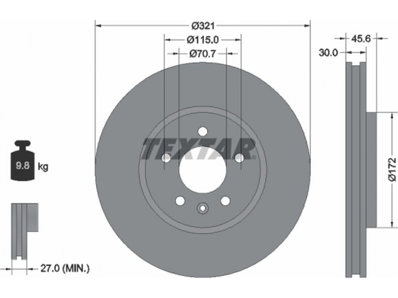 Criteries : Βάρος [kg] 9,8, Διάμετρος κέντρωσης [mm] 70,7, Διάμετρος κύκλου οπής [mm] 115, Διάμετρος οπής μπουλονιού τροχού [mm] 14,2, Ελάχιστο πάχος [mm] 27, Εξωτερική διάμετρος [mm] 321, Επιφάνεια με επίστρωση, Εσωτερική διάμετρος [mm] 160,2, μήκος συσκευασίας [cm] 34,3, Πατρόν τρύπας/αριθμός τρυπών 05/06, Πάχος δισκόπλακας [mm] 30, πλάτος συσκευασίας [cm] 34,3, Συμπληρωματικό προϊόν/ πληροφορίες 2 χωρίς μπουλόνια στερέωσης τροχού, Συμπληρωματικό προϊόν/ πληροφορίες 2 χωρίς πλήμνη, Συμπληρωματικό προϊόν/ πληροφορίες 2 χωρίς ρουλεμάν τροχού, Τύπος δισκόφρενων εσωτερικά αεριζόμενο, Υψος [mm] 45,6, ύψος συσκευασίας [cm] 7,5