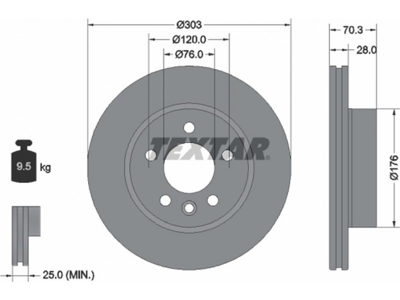 Criteries : Βάρος [kg] 9,5, Διάμετρος κέντρωσης [mm] 76, Διάμετρος κύκλου οπής [mm] 120, Διάμετρος οπής μπουλονιού τροχού [mm] 16,5, Ελάχιστο πάχος [mm] 25, Εξωτερική διάμετρος [mm] 303, Επιφάνεια με επίστρωση, Εσωτερική διάμετρος [mm] 165,3, μήκος συσκευασίας [cm] 31,3, Πατρόν τρύπας/αριθμός τρυπών 05/06, Πάχος δισκόπλακας [mm] 28, πλάτος συσκευασίας [cm] 31,3, Συμπληρωματικό προϊόν/ πληροφορίες 2 χωρίς μπουλόνια στερέωσης τροχού, Συμπληρωματικό προϊόν/ πληροφορίες 2 χωρίς πλήμνη, Συμπληρωματικό προϊόν/ πληροφορίες 2 χωρίς ρουλεμάν τροχού, Τύπος δισκόφρενων εσωτερικά αεριζόμενο, Υψος [mm] 70,3, ύψος συσκευασίας [cm] 10