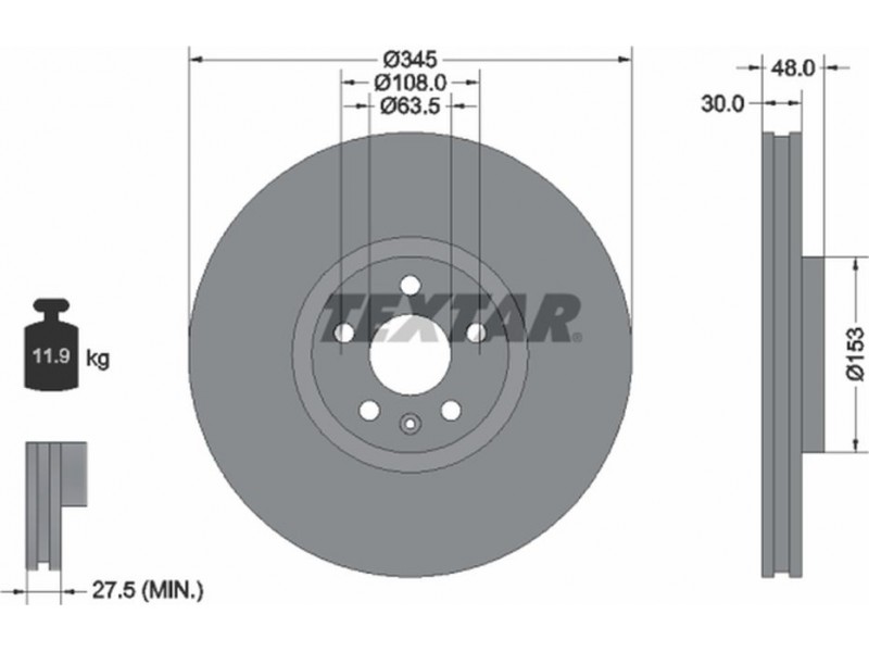 Criteries : Βάρος [kg] 11,9, Διάμετρος κέντρωσης [mm] 63,5, Διάμετρος κύκλου οπής [mm] 108, Διάμετρος οπής μπουλονιού τροχού [mm] 15,8, Ελάχιστο πάχος [mm] 27,5, Εξωτερική διάμετρος [mm] 345, Επεξεργασία υψηλής ανθράκωσης, Επιφάνεια με επίστρωση, Εσωτερική διάμετρος [mm] 141, μήκος συσκευασίας [cm] 36,8, Πατρόν τρύπας/αριθμός τρυπών 05/06, Πάχος δισκόπλακας [mm] 30, πλάτος συσκευασίας [cm] 36,8, Συμπληρωματικό προϊόν/ πληροφορίες 2 χωρίς μπουλόνια στερέωσης τροχού, Συμπληρωματικό προϊόν/ πληροφορίες 2 χωρίς πλήμνη, Συμπληρωματικό προϊόν/ πληροφορίες 2 χωρίς ρουλεμάν τροχού, Τύπος δισκόφρενων εσωτερικά αεριζόμενο, Υψος [mm] 48, ύψος συσκευασίας [cm] 7