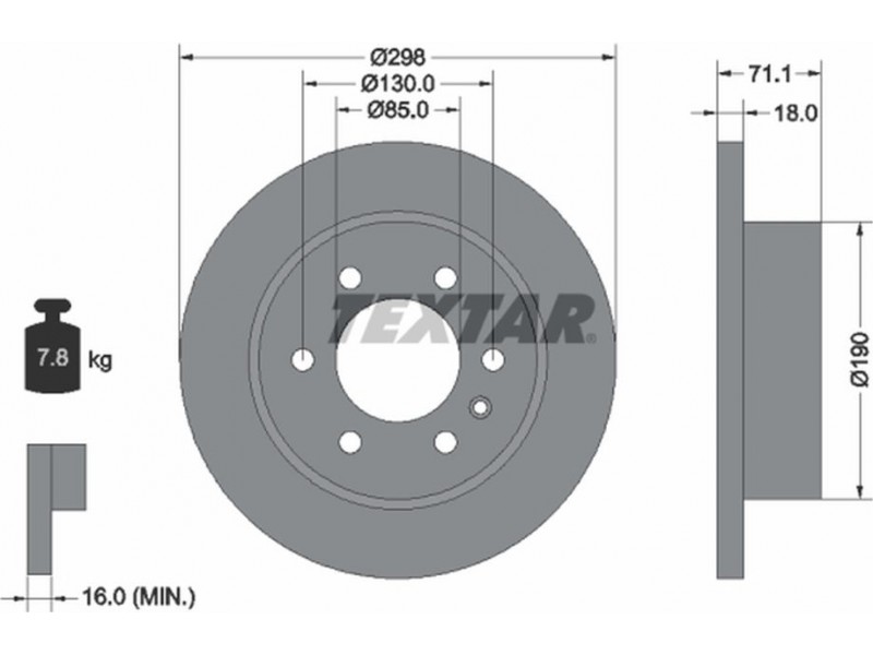 Criteries : Βάρος [kg] 7,8, Διάμετρος κέντρωσης [mm] 85, Διάμετρος κύκλου οπής [mm] 130, Διάμετρος οπής μπουλονιού τροχού [mm] 15,2, Ελάχιστο πάχος [mm] 16, Εξωτερική διάμετρος [mm] 298, Επιφάνεια με επίστρωση, Εσωτερική διάμετρος [mm] 180, μήκος συσκευασίας [cm] 30,8, Πατρόν τρύπας/αριθμός τρυπών 06/07, Πάχος δισκόπλακας [mm] 18, πλάτος συσκευασίας [cm] 30,8, Συμπληρωματικό προϊόν/ πληροφορίες 2 χωρίς μπουλόνια στερέωσης τροχού, Συμπληρωματικό προϊόν/ πληροφορίες 2 χωρίς πλήμνη, Συμπληρωματικό προϊόν/ πληροφορίες 2 χωρίς ρουλεμάν τροχού, Τύπος δισκόφρενων πλήρες, Υψος [mm] 71,1, ύψος συσκευασίας [cm] 16