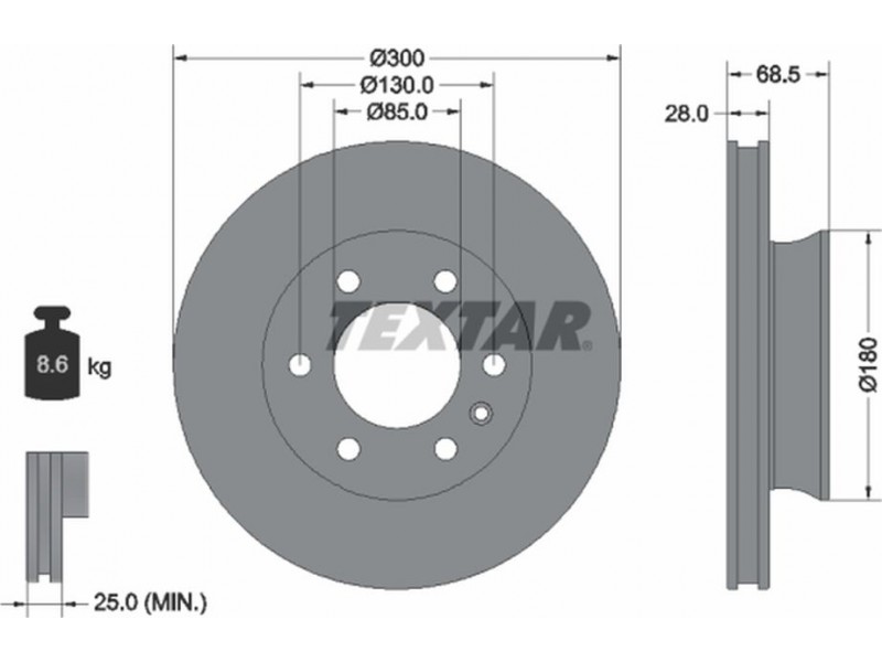 Criteries : Βάρος [kg] 8,6, Διάμετρος κέντρωσης [mm] 85, Διάμετρος κύκλου οπής [mm] 130, Διάμετρος οπής μπουλονιού τροχού [mm] 15,2, Ελάχιστο πάχος [mm] 25, Εξωτερική διάμετρος [mm] 300, Επιφάνεια με επίστρωση, Εσωτερική διάμετρος [mm] 154,8, μήκος συσκευασίας [cm] 30,8, Πατρόν τρύπας/αριθμός τρυπών 06/07, Πάχος δισκόπλακας [mm] 28, πλάτος συσκευασίας [cm] 30,8, Συμπληρωματικό προϊόν/ πληροφορίες 2 χωρίς μπουλόνια στερέωσης τροχού, Συμπληρωματικό προϊόν/ πληροφορίες 2 χωρίς πλήμνη, Συμπληρωματικό προϊόν/ πληροφορίες 2 χωρίς ρουλεμάν τροχού, Τύπος δισκόφρενων εσωτερικά αεριζόμενο, Υψος [mm] 68,5, ύψος συσκευασίας [cm] 16
