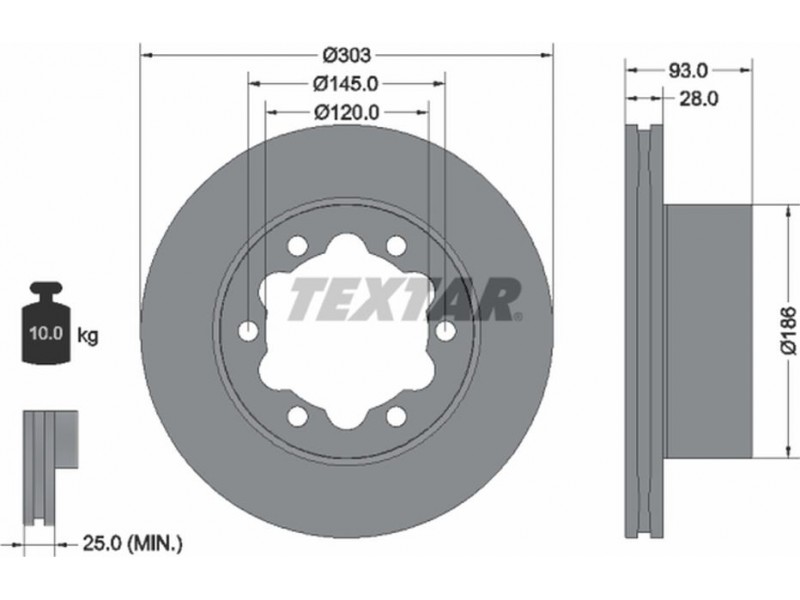Criteries : Βάρος [kg] 10, Διάμετρος κέντρωσης [mm] 120, Διάμετρος κύκλου οπής [mm] 145, Διάμετρος οπής μπουλονιού τροχού [mm] 15, Ελάχιστο πάχος [mm] 25, Εξωτερική διάμετρος [mm] 303, Επιφάνεια με επίστρωση, Εσωτερική διάμετρος [mm] 172, μήκος συσκευασίας [cm] 32,8, Πατρόν τρύπας/αριθμός τρυπών 06/06, Πάχος δισκόπλακας [mm] 28, πλάτος συσκευασίας [cm] 32,8, Συμπληρωματικό προϊόν/ πληροφορίες 2 χωρίς μπουλόνια στερέωσης τροχού, Συμπληρωματικό προϊόν/ πληροφορίες 2 χωρίς πλήμνη, Συμπληρωματικό προϊόν/ πληροφορίες 2 χωρίς ρουλεμάν τροχού, Τύπος δισκόφρενων εσωτερικά αεριζόμενο, Υψος [mm] 93, ύψος συσκευασίας [cm] 12,5