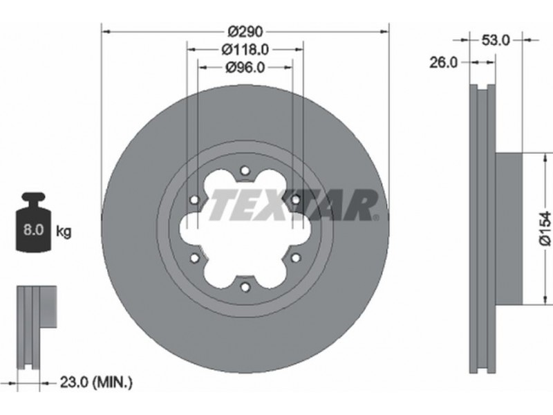 Criteries : Βάρος [kg] 8, Διάμετρος κέντρωσης [mm] 96, Διάμετρος κύκλου οπής [mm] 118, Διάμετρος οπής μπουλονιού τροχού [mm] 12, Ελάχιστο πάχος [mm] 23, Εξωτερική διάμετρος [mm] 290, Εσωτερική διάμετρος [mm] 1, μήκος συσκευασίας [cm] 30,8, Πατρόν τρύπας/αριθμός τρυπών 06/06, Πάχος δισκόπλακας [mm] 26, πλάτος συσκευασίας [cm] 30,8, Συμπληρωματικό προϊόν/ πληροφορίες 2 χωρίς μπουλόνια στερέωσης τροχού, Συμπληρωματικό προϊόν/ πληροφορίες 2 χωρίς πλήμνη, Συμπληρωματικό προϊόν/ πληροφορίες 2 χωρίς ρουλεμάν τροχού, Τύπος δισκόφρενων εσωτερικά αεριζόμενο, Υψος [mm] 53, ύψος συσκευασίας [cm] 12,7