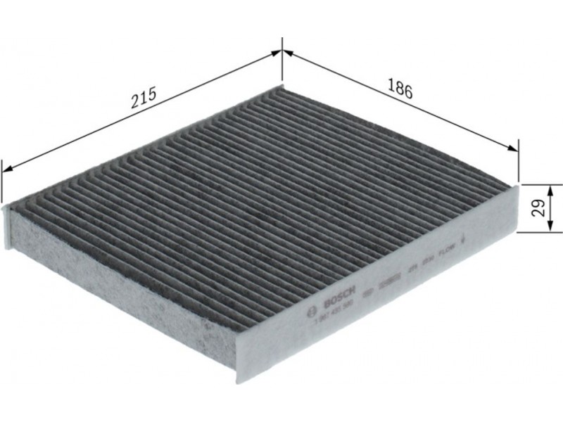Criteries : Βασική έκδοση (αρ. προϊόντος) 1987435108, Έκδοση εξαιρετ. απόδοσης με ενεργό άνθρακα (αρ. προϊόντος) 0986628581, Μήκος [mm] 215, Παραλλαγή φίλτρου φίλτρο ενεργού άνθρακα, Πλάτος [mm] 186, Ποσότητα 1, Υψος [mm] 29