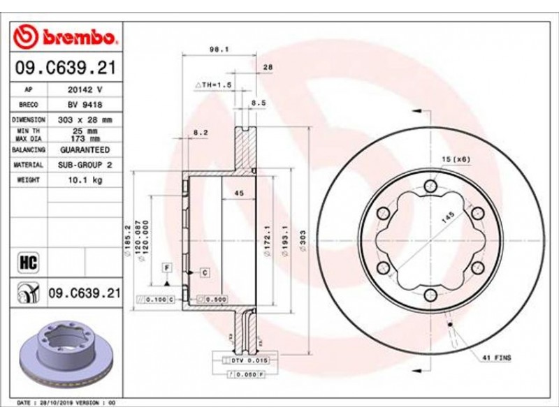 Criteries : Αριθμός οπών 6, Διάμετρος [mm] 303, Διάμετρος κέντρωσης [mm] 120, Ελάχιστο πάχος [mm] 25, Εξωτερική διάμετρος [mm] 303, Επεξεργασία υψηλής ανθράκωσης, Επιφάνεια με επίστρωση, Πάχος δισκόπλακας [mm] 28, Τύπος δισκόφρενων εσωτερικά αεριζόμενο, Υψος [mm] 98,1