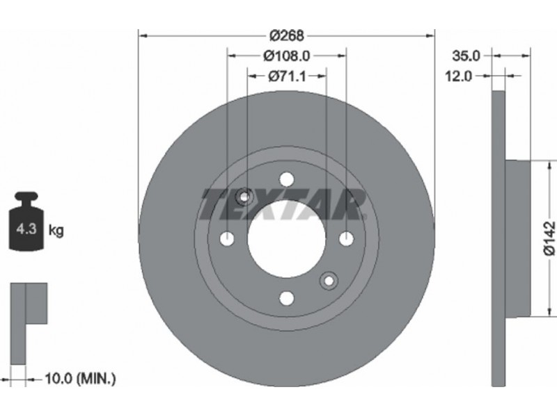 Criteries : Αριθμός τεχνικής πληροφορίας 98200 3259 0 1 PRO, Βάρος [kg] 4,3, Διάμετρος κέντρωσης [mm] 71,1, Διάμετρος κύκλου οπής [mm] 108, Ελάχιστο πάχος [mm] 10, Εξωτερική διάμετρος [mm] 268, Επιφάνεια με επίστρωση, μήκος συσκευασίας [cm] 30, Πατρόν τρύπας/αριθμός τρυπών 04/06, Πάχος δισκόπλακας [mm] 12, πλάτος συσκευασίας [cm] 28,5, Συμπληρωματικό προϊόν/ πληροφορίες 2 χωρίς μπουλόνια στερέωσης τροχού, Συμπληρωματικό προϊόν/ πληροφορίες 2 χωρίς πλήμνη, Τύπος δισκόφρενων Πλήρες, Υψος [mm] 35, ύψος συσκευασίας [cm] 8