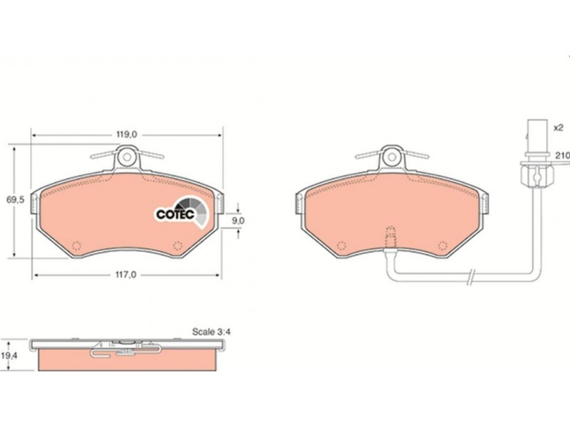 Criteries : Επαφή προειδοποίησης φθοράς συμπεριλ. επαφής για ένδειξη φθοράς, Μήκος επαφής προειδοποίησης [mm] 210, Πάχος [mm] 19,4, Περιορισμός κατασκευαστή TRW, Πλάτος [mm] 119, Πλήθος ενδείξεων φθοράς [ανά άξονα] 2, Στοιχεία ελέγχου E9 90R 01107/089, Υψος [mm] 69,5