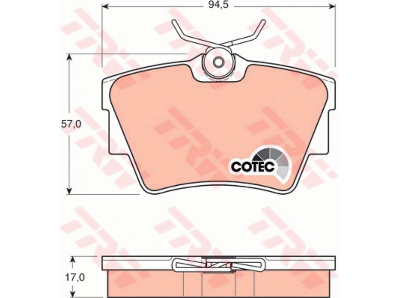 Criteries : Επαφή προειδοποίησης φθοράς όχι προετοιμασμένο για προειδοποιητική ένδειξη φθοράς, Πάχος [mm] 17, Περιορισμός κατασκευαστή TRW, Πλάτος [mm] 94,5, Στοιχεία ελέγχου E9 90R 01708/014, Συμπληρωματικό προϊόν / συμπληρωματική πληροφορία με αξεσουάρ, Συμπληρωματικό προϊόν/ πληροφορίες 2 με βίδες δαγκάνας φρένων, Υψος [mm] 57