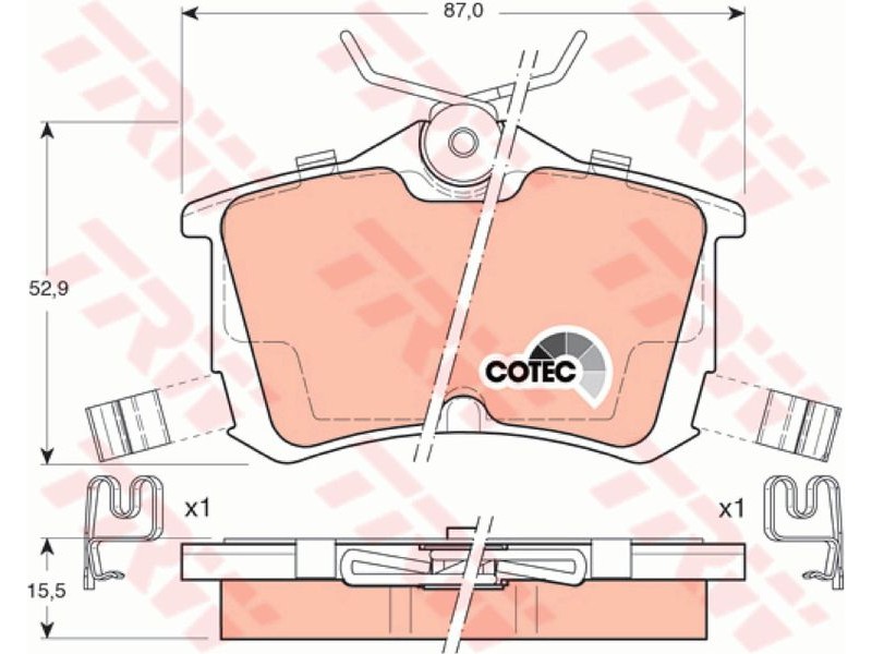 Criteries : Επαφή προειδοποίησης φθοράς με ηχητική προειδοποίηση φθοράς, Πάχος [mm] 15,5, Περιορισμός κατασκευαστή TRW, Πλάτος [mm] 87, Στοιχεία ελέγχου E9 90R - 01120/270, Συμπληρωματικό προϊόν / συμπληρωματική πληροφορία με αξεσουάρ, Συμπληρωματικό προϊόν/ πληροφορίες 2 με βίδες δαγκάνας φρένων, Υψος [mm] 52,9
