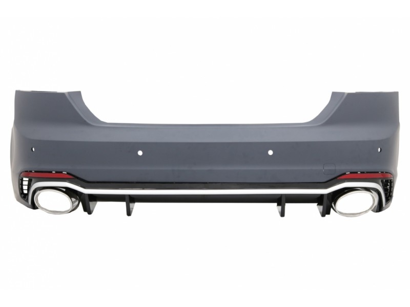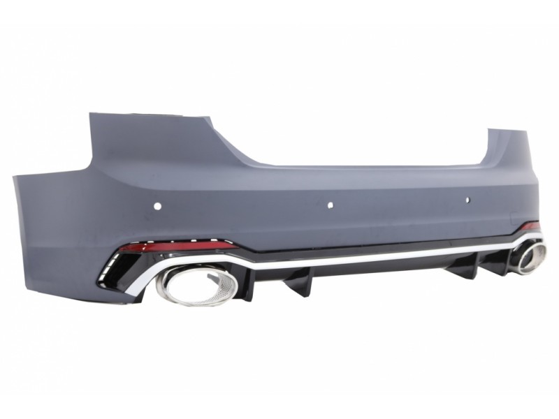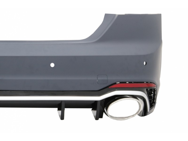 Πίσω προφυλακτήρας με διαχύτη Quattro RS Design σε μαύρο χρώμα με δύο σιγαστήρες εξάτμισης μονής εξόδου, κάλυμμα γάντζου ρυμούλκησης και κόκκινους πλευρικούς ανακλαστήρες