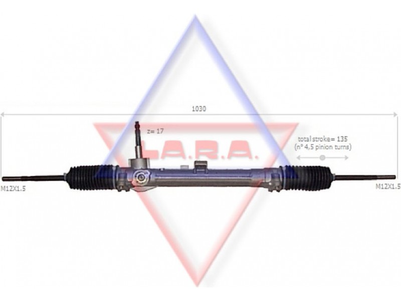 Criteries : Απόσταση των οπών στερέωσης [mm] 386, Αριθμός δοντιών, στέλεχος εισόδου 17, Αριστερή ή δεξιά κυκλοφορία για δεξιά κυκλοφορία, Αριστερό ή δεξιό τιμόνι για αριστεροτίμονα οχήματα, Διάμετρος, στέλεχος εισόδου [mm] 14,1, Διαστάσεις σπειρώματος αξονικής άρθρωσης M12x1,5, Είδος κιβωτίου συστήματος οδήγησης Οδοντωτή ράβδος - πυξίδα διεύθυνσης, Εξοπλισμός οχήματος για οχήμ. χωρίς υποβοήθηση τιμονιού, Μήκος 1/ μήκος 2 [mm] stroke= 135, Ολικό μήκος [mm] 1030, Πλήθος των στροφών τιμονιού 4,5, Τρόπος λειτουργίας μηχανικό, Τρόπος λειτουργίας χειροκίνητο, Τύπος σπειρώματος αξονικής άρθρωσης με εξωτερικό σπείρωμα, Τύπος σύνδεσης, στέλεχος εισόδου οδοντωτό, Ύψος, στέλεχος εισόδου [mm] 96,5