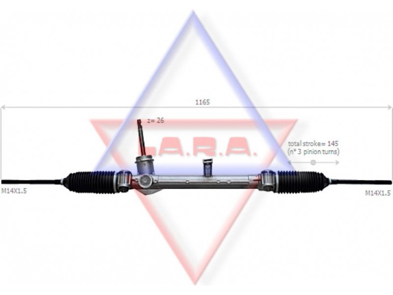 Criteries : Απόσταση των οπών στερέωσης [mm] 412, Αριθμός δοντιών, στέλεχος εισόδου 26, Αριστερή ή δεξιά κυκλοφορία για δεξιά κυκλοφορία, Αριστερό ή δεξιό τιμόνι για αριστεροτίμονα οχήματα, Διάμετρος, στέλεχος εισόδου [mm] 14,1, Διαστάσεις σπειρώματος αξονικής άρθρωσης M14x1,5, Είδος κιβωτίου συστήματος οδήγησης Οδοντωτή ράβδος - πυξίδα διεύθυνσης, Μήκος 1/ μήκος 2 [mm] stroke= 145, Ολικό μήκος [mm] 1165, Πλήθος των στροφών τιμονιού 3, Τρόπος λειτουργίας ηλεκτρικό, Τρόπος λειτουργίας χειροκίνητο, Τύπος σπειρώματος αξονικής άρθρωσης με εξωτερικό σπείρωμα, Τύπος σύνδεσης, στέλεχος εισόδου οδοντωτό, Ύψος, στέλεχος εισόδου [mm] 114