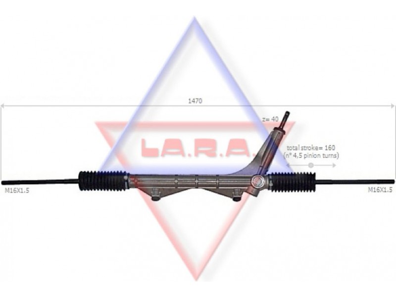 Criteries : Απόσταση των οπών στερέωσης [mm] 300, Αριθμός δοντιών, στέλεχος εισόδου 40, Αριστερή ή δεξιά κυκλοφορία για δεξιά κυκλοφορία, Αριστερό ή δεξιό τιμόνι για αριστεροτίμονα οχήματα, Διάμετρος, στέλεχος εισόδου [mm] 17,2, Διαστάσεις σπειρώματος αξονικής άρθρωσης M16x1,5, Είδος κιβωτίου συστήματος οδήγησης Οδοντωτή ράβδος - πυξίδα διεύθυνσης, Μήκος 1/ μήκος 2 [mm] stroke= 160, Ολικό μήκος [mm] 1470, Πλήθος των στροφών τιμονιού 4,5, Τρόπος λειτουργίας μηχανικό, Τρόπος λειτουργίας χειροκίνητο, Τύπος σπειρώματος αξονικής άρθρωσης με εξωτερικό σπείρωμα, Τύπος σύνδεσης, στέλεχος εισόδου οδοντωτό, Ύψος, στέλεχος εισόδου [mm] 76