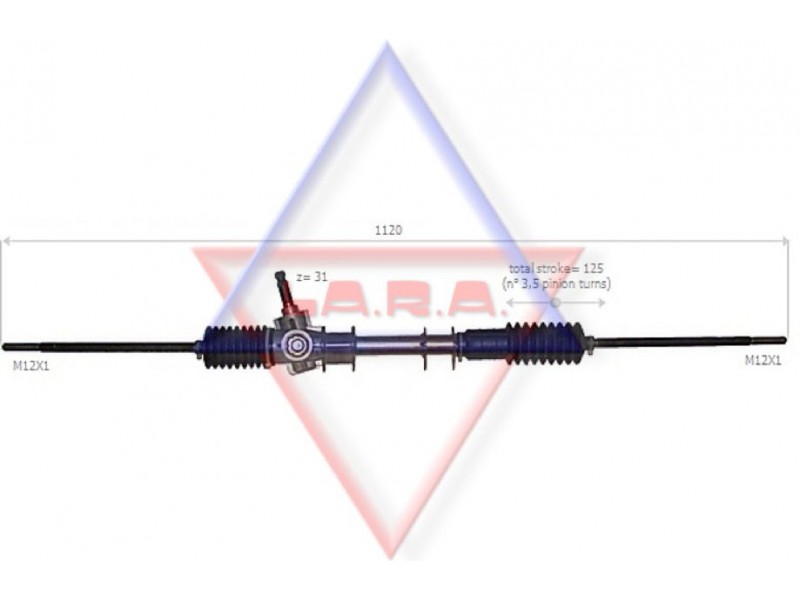 Criteries : Αριθμός δοντιών, στέλεχος εισόδου 31, Αριστερή ή δεξιά κυκλοφορία για δεξιά κυκλοφορία, Αριστερό ή δεξιό τιμόνι για αριστεροτίμονα οχήματα, Διάμετρος, στέλεχος εισόδου [mm] 15,9, Διαστάσεις σπειρώματος αξονικής άρθρωσης M12x1, Είδος κιβωτίου συστήματος οδήγησης Οδοντωτή ράβδος - πυξίδα διεύθυνσης, Μήκος 1/ μήκος 2 [mm] stroke= 125, Ολικό μήκος [mm] 1120, Πλήθος των στροφών τιμονιού 3,5, Τρόπος λειτουργίας μηχανικό, Τρόπος λειτουργίας χειροκίνητο, Τύπος σπειρώματος αξονικής άρθρωσης με εξωτερικό σπείρωμα, Τύπος σύνδεσης, στέλεχος εισόδου οδοντωτό, Ύψος, στέλεχος εισόδου [mm] 64