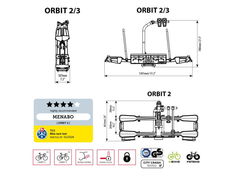 Βάση ποδηλάτου κοτσαδόρου Orbit 2 από την Menabo, 100% ιταλικής προέλευσης και κατασκευής, ιδανική για τη μεταφορά 2 ποδηλάτων, συμβατή με FAT bikes και e-bikes, κατάλληλη για οχήματα που διαθέτουν κοτσαδόρο, ώστε να απολαμβάνετε το αγαπημένο σας άθλημα παντού!