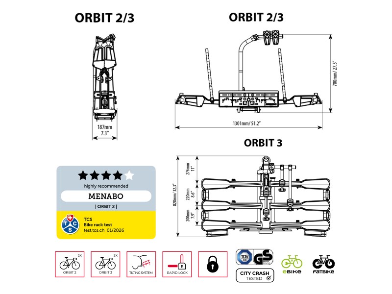 Βάση ποδηλάτου κοτσαδόρου Orbit 3 από την Menabo, 100% ιταλικής προέλευσης και κατασκευής, ιδανική για τη μεταφορά 3 ποδηλάτων, συμβατή με FAT bikes και e-bikes, κατάλληλη για οχήματα που διαθέτουν κοτσαδόρο, ώστε να απολαμβάνετε το αγαπημένο σας άθλημα παντού!