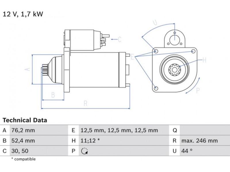 Criteries : Αριθμός δοντιών 11, Αριθμός δοντιών 12, Αρχική θέση γραναζιού [mm] 52,4, Γωνία Οπή στερέωσης [μοίρες] 44, Γωνία στήριξης [μοίρες] 44, Διάμετρος οπής 2 [mm] 12,5, Διαμέτρος οπής 3 [mm] 12,5, Διάμετρος οπής [mm] 12,5, Διάμετρος φλάντζας [mm] 76,2, Επαφή 30, Επαφή 50, Θέση/βαθμοί links, Ισχύς μίζας [kW] 1,7, Μήκος [mm] 246, Παλαιό εξάρτημα , Παραλλαγή μίζας ελεύθερο, Πλήθος οπών με βόλτα 0, Πλήθος των οπών στερέωσης 3, Τάση [V] 12, Φορά περιστροφής Φορά περιστρ. αντίθετα προς τη φορά των δεικτών του ρολογιού
