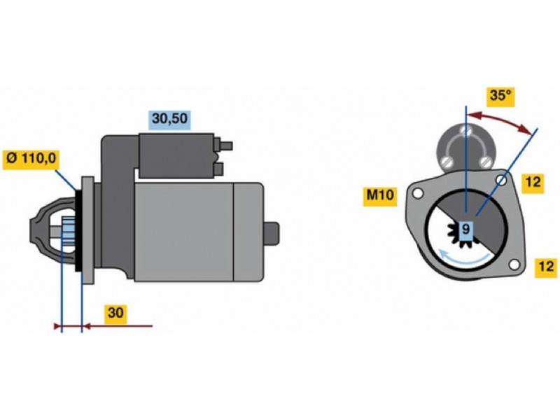 Criteries : Αριθμός δοντιών 9, Αρχική θέση γραναζιού [mm] 27, Γωνία Οπή στερέωσης [μοίρες] 35, Γωνία στήριξης [μοίρες] 35, Γωνία Στόμιο [μοίρες] 130, Διαμέτρος οπής 3 [mm] 12, Διάμετρος οπής [mm] 12, Διάμετρος φλάντζας [mm] 110, Διαστάσεις σπειρώματος 1 M10x1.5, Επαφή 30, Επαφή 50, Θέση/βαθμοί rechts, Ισχύς μίζας [kW] 2,5, Μήκος [mm] 247, Παραλλαγή μίζας αυτοέδραση, Πλήθος οπών με βόλτα 1, Πλήθος των οπών στερέωσης 2, Τάση [V] 12, Φορά περιστροφής Φορά περιστροφής προς τα δεξιά