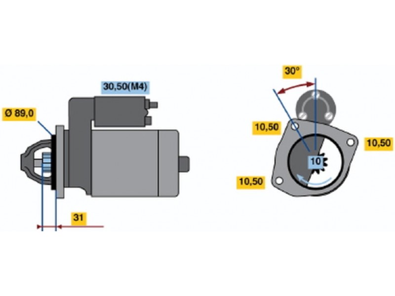 Criteries : Αριθμός δοντιών 10, Αρχική θέση γραναζιού [mm] 28, Γωνία Οπή στερέωσης [μοίρες] 30, Γωνία στήριξης [μοίρες] 30, Γωνία Στόμιο [μοίρες] 20, Διάμετρος οπής 2 [mm] 10,5, Διαμέτρος οπής 3 [mm] 10,5, Διάμετρος οπής [mm] 10,5, Διάμετρος φλάντζας [mm] 89, Επαφή 30, Επαφή 50, Θέση/βαθμοί links, Ισχύς μίζας [kW] 4, Μήκος [mm] 317, Παραλλαγή μίζας αυτοέδραση, Πλήθος οπών με βόλτα 0, Πλήθος των οπών στερέωσης 3, Τάση [V] 24, Φορά περιστροφής Φορά περιστροφής προς τα δεξιά