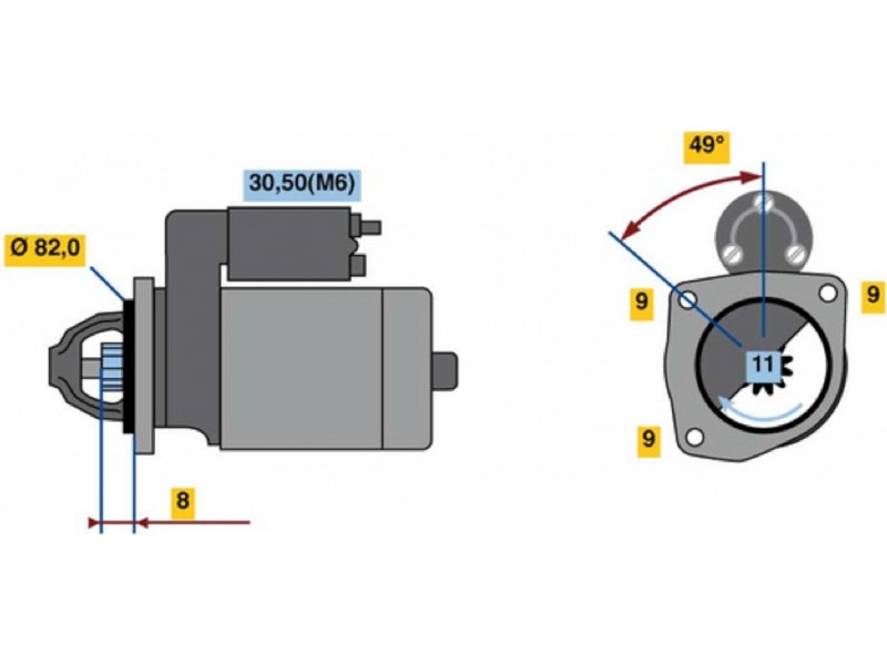 Criteries : Αριθμός δοντιών 11, Αρχική θέση γραναζιού [mm] 4,5, Γωνία Οπή στερέωσης [μοίρες] 49, Γωνία στήριξης [μοίρες] 49, Γωνία Στόμιο [μοίρες] 45, Διάμετρος οπής 2 [mm] 9, Διαμέτρος οπής 3 [mm] 9, Διάμετρος οπής [mm] 9, Διάμετρος φλάντζας [mm] 82, Επαφή 30, Επαφή 50, Θέση/βαθμοί links, Ισχύς μίζας [kW] 2,2, Μήκος [mm] 235, Παραλλαγή μίζας αυτοέδραση, Πλήθος οπών με βόλτα 0, Πλήθος των οπών στερέωσης 3, Τάση [V] 12, Φορά περιστροφής Φορά περιστροφής προς τα δεξιά